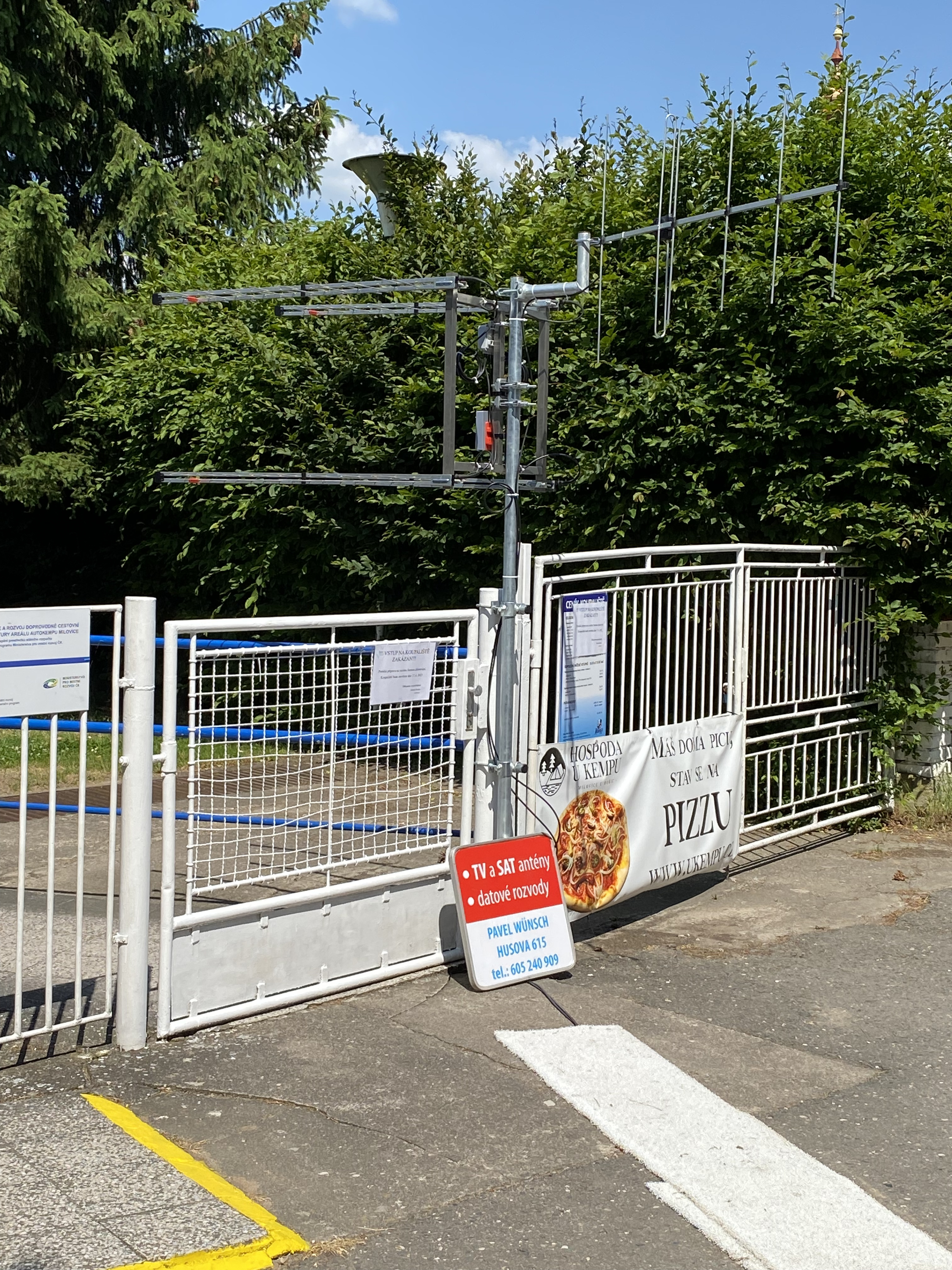 Jako improvizovaný držák stožáru antén pro UHF a DAB perfektně posloužil sloupek branky místního koupaliště