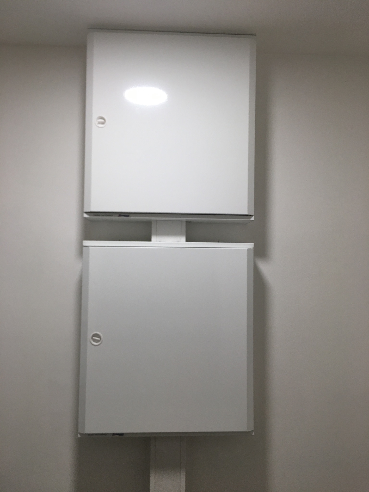 Realizace anténní rozvodu Ostrov, rozvodnice STA (nahoře), klasický rozvaděč (dole), montáž v technické místnosti