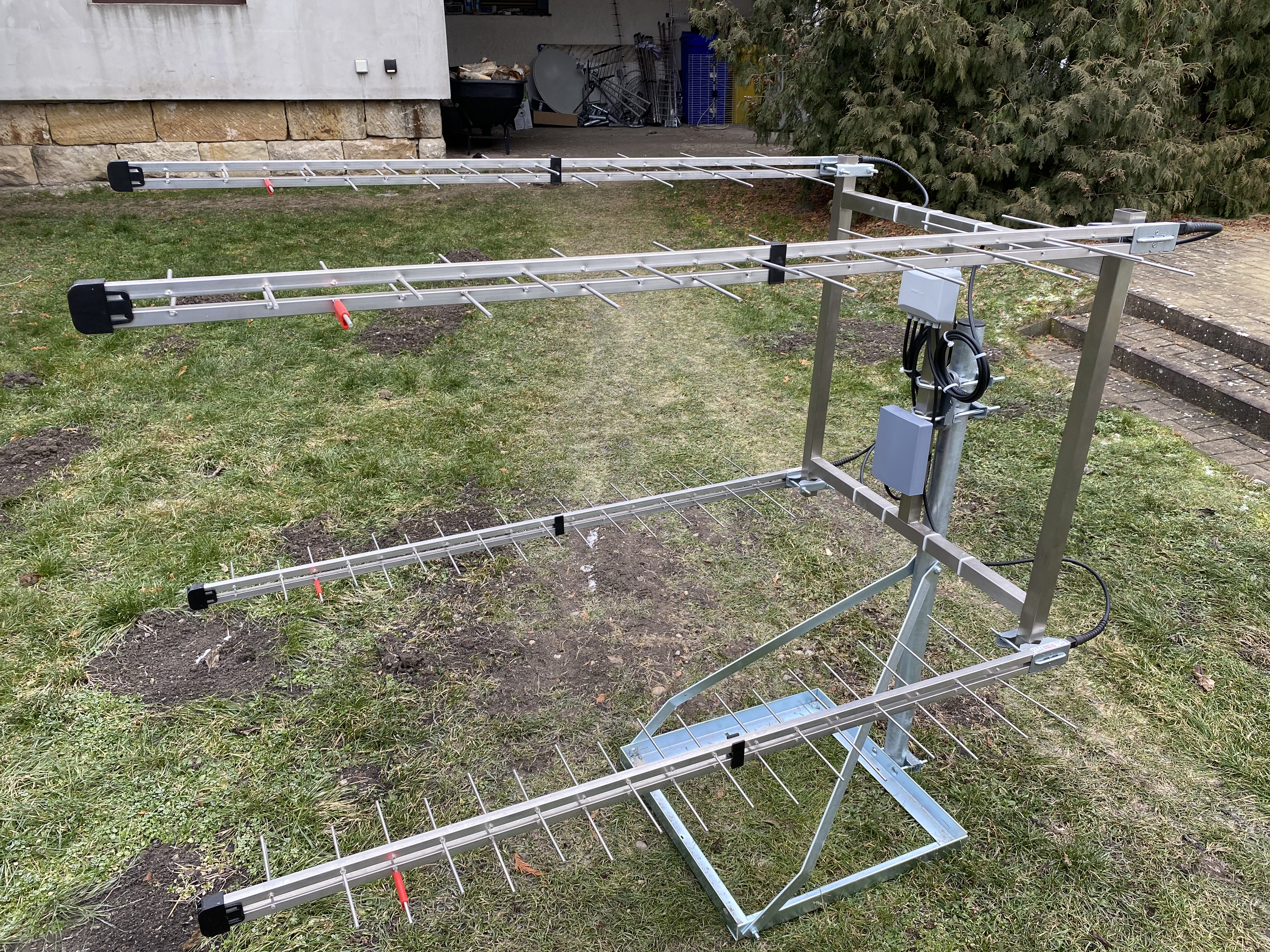S ohledem na vše dosud napsané jsem navrhl a realizoval anténní soustavu ze čtyř antén Emme Esse 45 UC (viz výše) s rozsahem kanálů 21-48, namontované na jednouchou konstrukci.