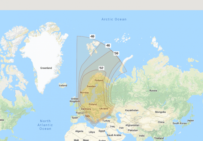Pokrytí Evropy družicí THOR 7 Ku svazek