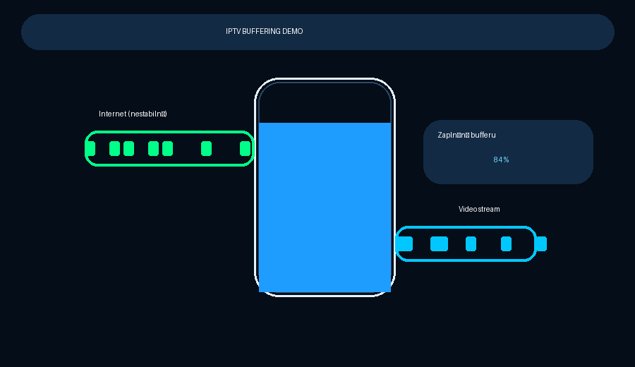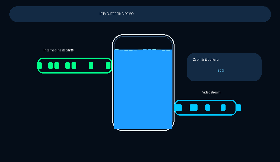 Proto je součástí aplikace pro internetovou televizi právě buffer, který se při spuštění aplikace zaplní daty, která jsou z něj následně plynule odebírána do přehrávače. Buuffer tedy slouží jako vyrovnávací zásobník v okamžku, kdy datové pakety z internetu mají zpoždění.