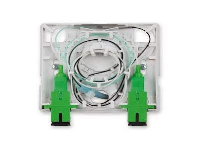 Obrázek je pouze ilustrační a znázorňuje koncovou zásuvku se dvěma optickými kabely a konektory.